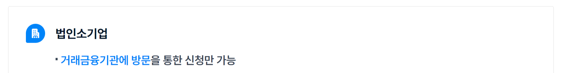 법인 소기업의 경우, 지원 대상임을 증빙하기 위해 중소기업확인서를 제출해야 하므로 직접 금융기관을 방문하여 신청할 수 있습니다.