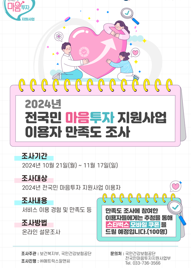 전국민 마음투자 지원사업의 품질 향상을 위해 보건복지부는 이용자 만족도 조사를 2024년 10월 21일부터 11월 17일까지 진행합니다. 이 조사는 서비스 제공에 대한 국민의 의견을 청취하고, 향후 정책 개선에 반영될 중요한 자료로 활용됩니다. 조사 내용에는 서비스 신청 절차, 제공인력의 전문성과 친절도, 전반적인 만족도 등이 포함됩니다.