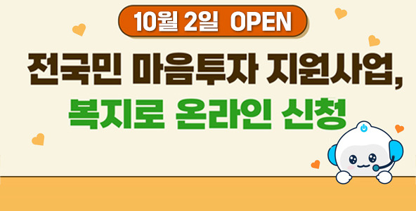 - 로그인 후, 복지급여 신청 화면에서 ‘전국민 마음투자 지원사업 신청하기’를 선택하고 신청서를 작성한 후 필요한 증빙서류(의뢰서 등)를 첨부하면 신청이 완료됩니다.