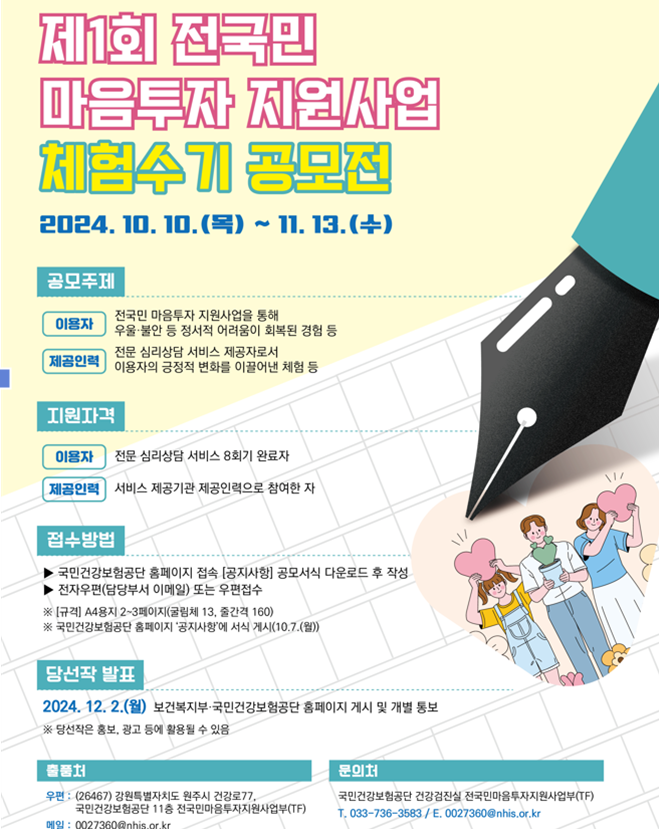 국민건강보엄공단 누리집(www.nhis.or.kr)에서 공모 서식을 다운로드한 후, 자신의 체험을 작성하여 제출하면 됩니다. 서비스 이용 후의 정서적 회복 경험이나 상담 제공자로서 겪은 긍정적인 변화 등을 자유롭게 서술할 수 있습니다.