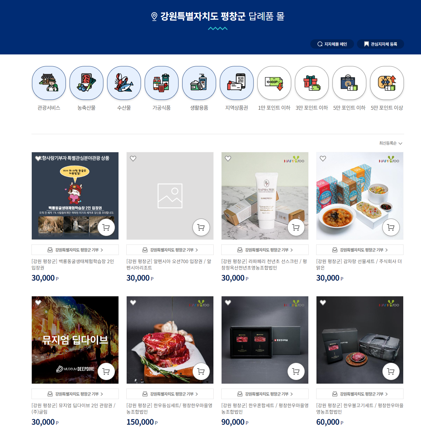 예를 들어 강원특별자치도 평창군을 선택하면 아래와 같은 답례품 목록이 뜹니다.