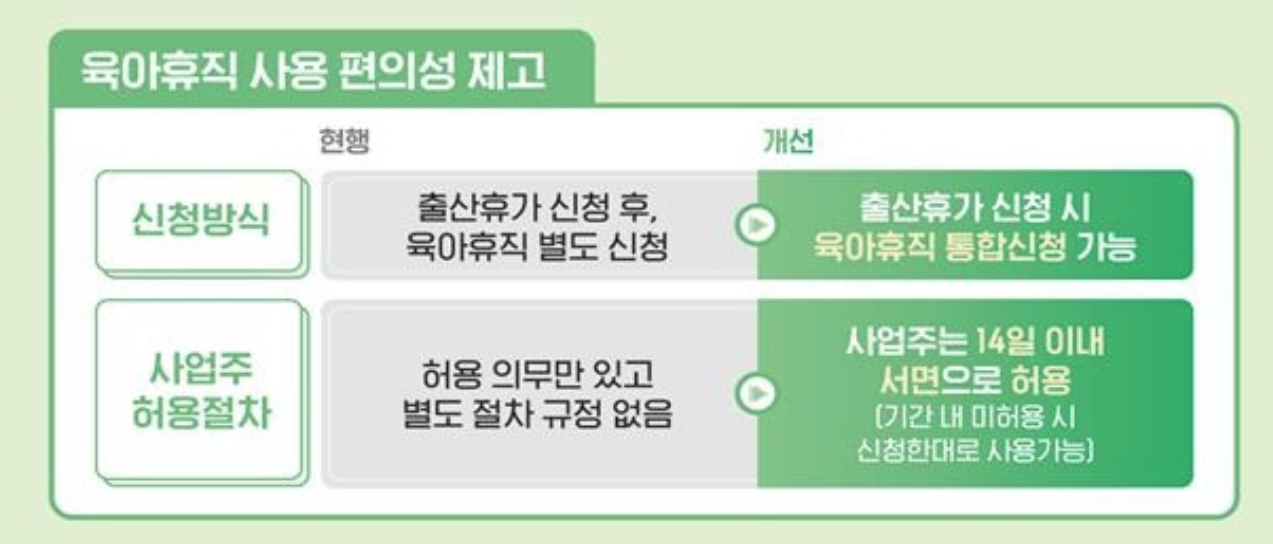 3) 출산휴가와 육아휴직 통합 신청도 새로운 변화 중 하나입니다. 기존에는 출산휴가를 먼저 신청한 후 육아휴직을 따로 신청해야 했지만, 내년부터는 출산휴가와 육아휴직을 한 번에 통합 신청할 수 있어 절차가 간소화됩니다.