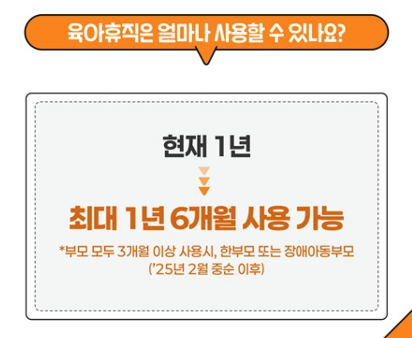육아휴직 기간도 내년부터 확대됩니다. 부모 모두가 3개월 이상 육아휴직을 사용할 경우, 육아휴직 기간은 기존 1년에서 1년 6개월까지 늘어나게 됩니다.
