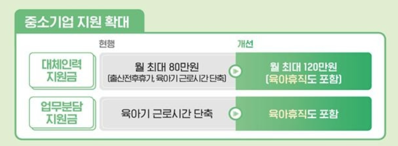 1) 가장 눈에 띄는 변화는 중소기업 근로자에 대한 지원 확대입니다. 중소기업의 경우, 육아휴직 대체인력 지원금이 월 80만 원에서 120만 원으로 인상됩니다.