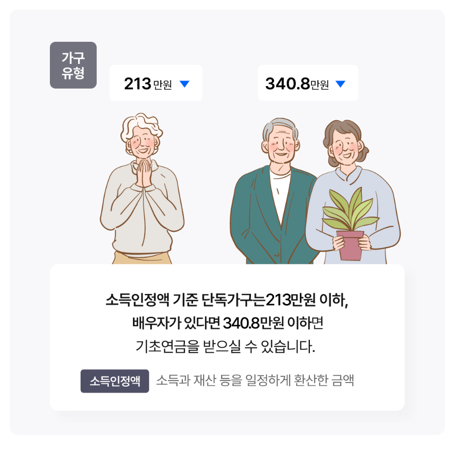 - 2024년 기초연금 선정기준액 : 단독가구 월 213만원 / 부부가구 월 340.8만원