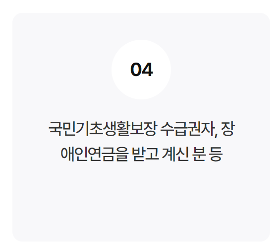 - 국민기초생활보장 수급권자, 장애인연금을 받고 계신 분 등