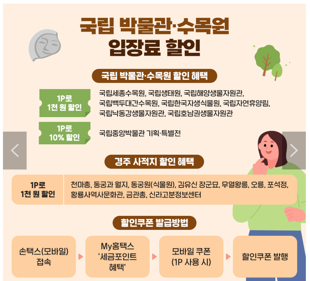 - 국립 박물관, 수목원 입장료 할인, 경주시 사적지(경북 경주)* 입장료 1천원 정액 할인(1P 사용)