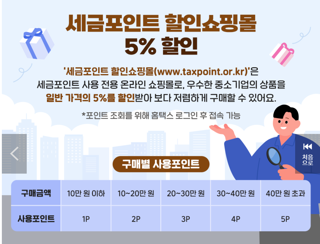 세금포인트를 사용하여 우수한 중소기업 제품을 5% 할인 구매 가능합니다.