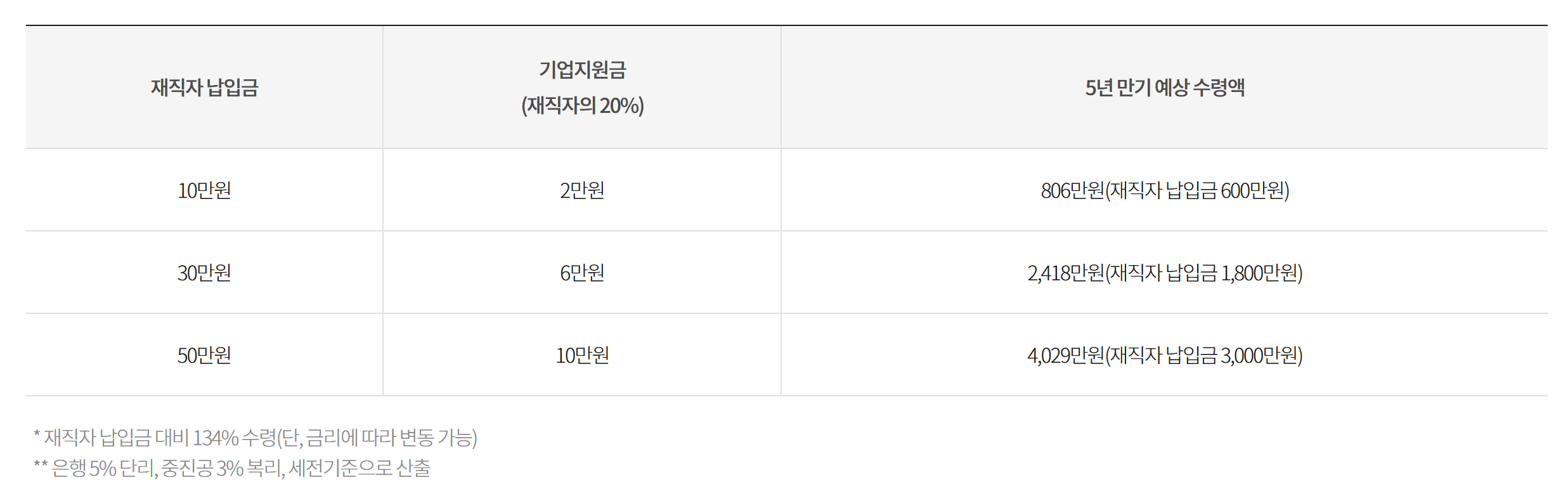 - 기업 : 월 2만원 ~ 10만원(가입 단위 1천원, 재직자 납부금의 20%)