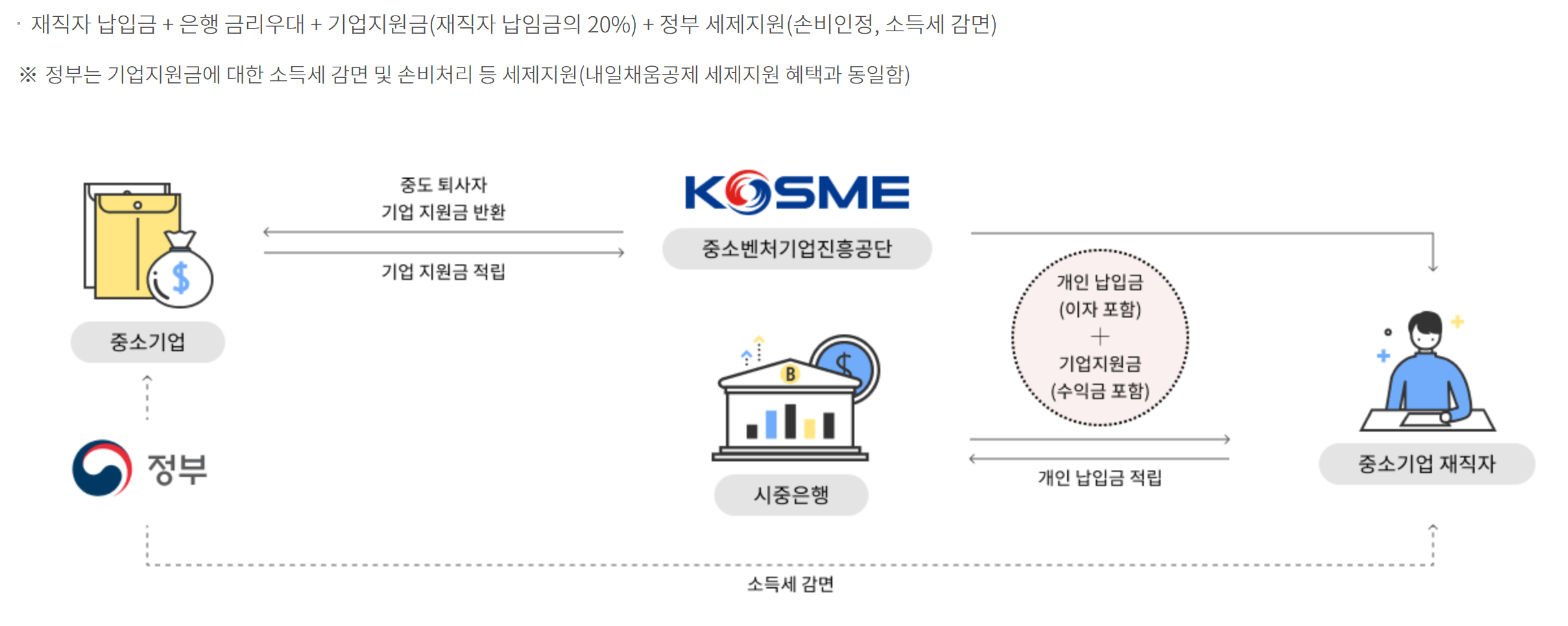 - 정부 : 만기시 기업지원금에 대한 소득세 50%(청년근로자 90%) 감면 혜택