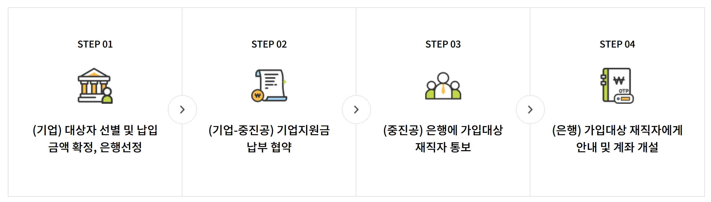 가입을 원하는 근로자는 1) 소속된 중소기업과 협의한 후, 2) 중소벤처기업진흥공단에서 신청할 수 있습니다.