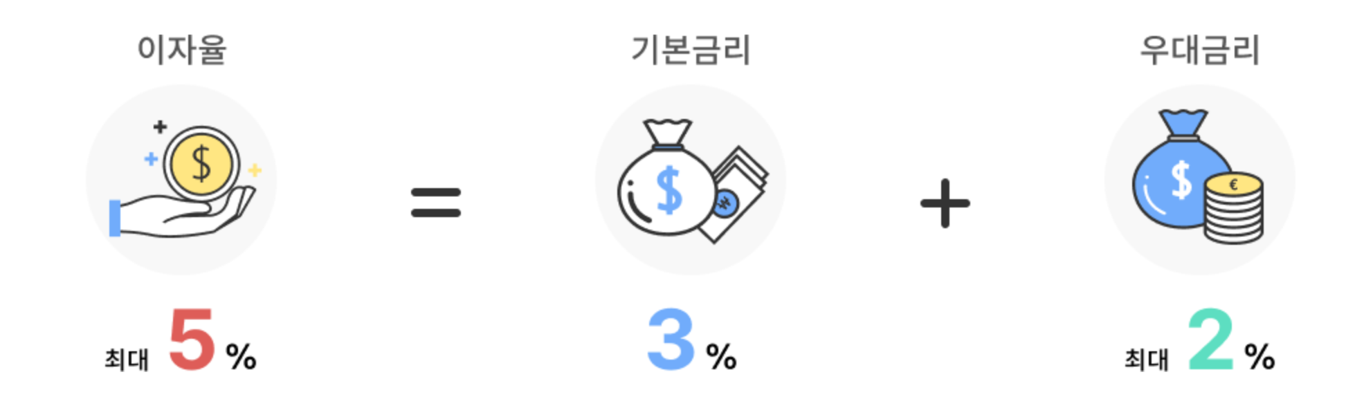 기본 금리는 3%이며 우대 금리를 최대 2%까지 추가로 받을 수 있어 연 최고 5%의 금리가 적용됩니다.