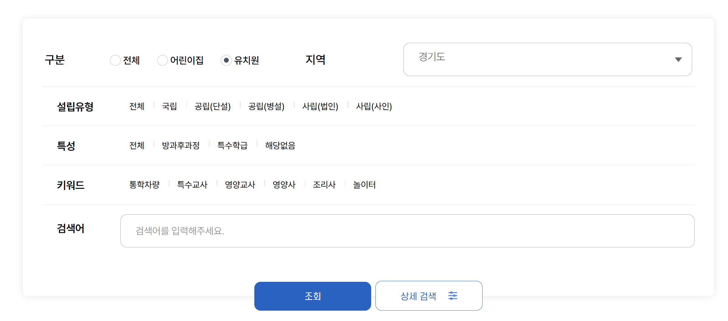 상세검색을 통해 설립유형(국립, 공립_단설, 공립_병설, 사립_법인, 사립_사인), 특성(방과후과정, 특수학급), 키워드(통학차량, 특수교사, 영양교사, 영양사, 조리사, 놀이터)를 통해 통합적으로 비교해볼 수 있게 되었습니다.