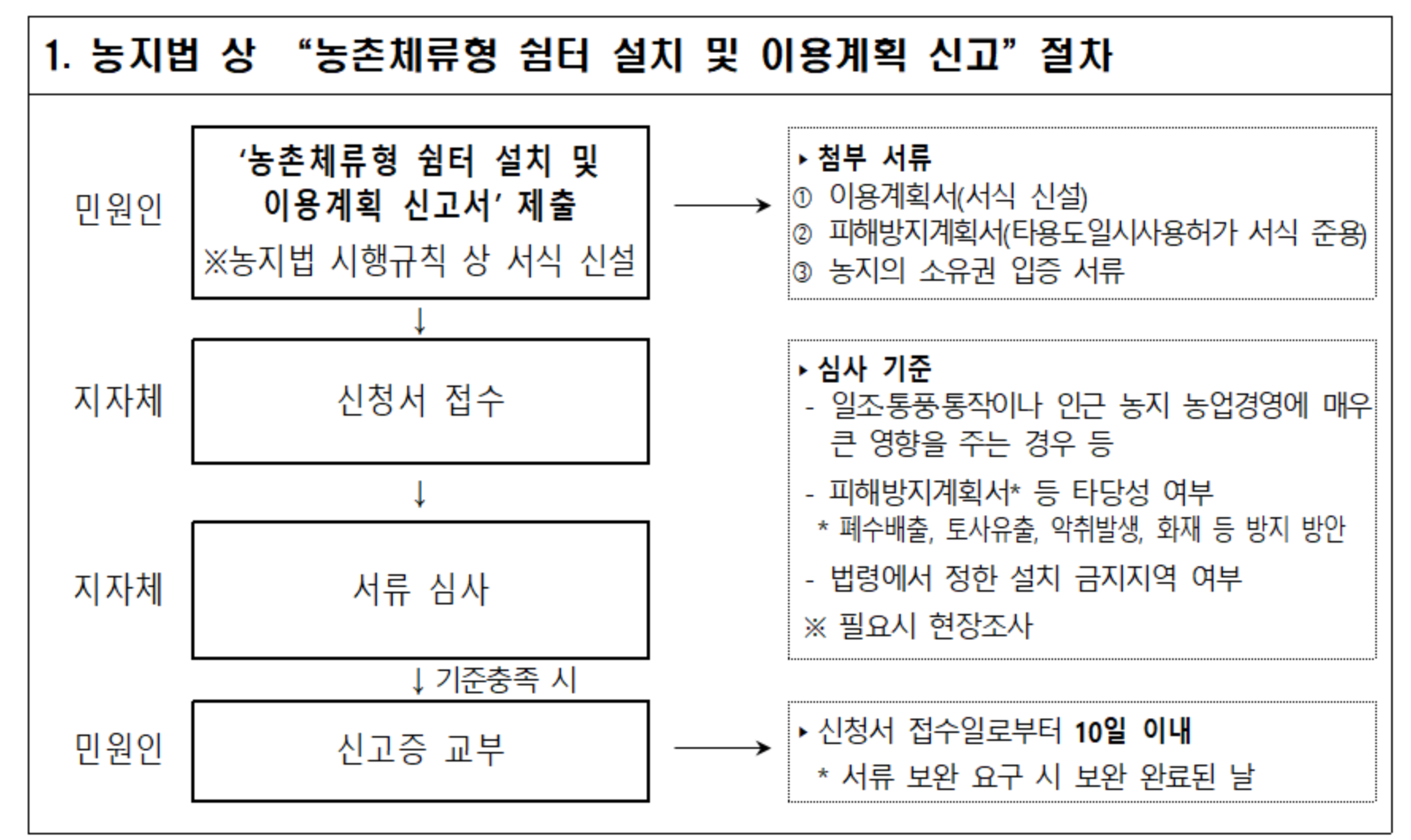 농지 소재지 관할 시·구·읍·면장에게 「농지법 시행규칙」별지 제58호의3 쉼터 설치 및 이용계획 신고서 제출, 지자체 시설 입지 및 안전기준 확인 후 「건축법」에 의한 가설건축물 축조 신고 또는 건축신고를 하면 됩니다.