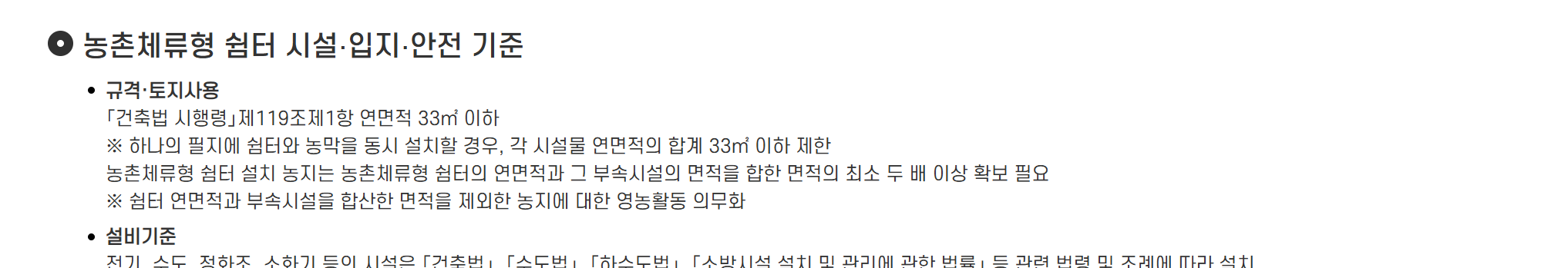 아래 링크 클릭하시어 농촌 체류형 쉼터 시설‧입지‧안전 기준에 대해 더 자세히 확인하시길 바랍니다.