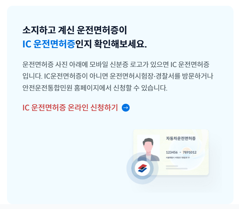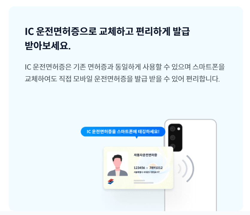 IC 운전면허증의 경우 앱 설치 후 바로 태그하여 발급 가능하며, IC칩 형식의 운전면허증이 없다면 먼저 IC칩 형식 운전면허증을 온라인으로 신청하거나, 운전면회협회에 방문해서 발급받으실 수 있습니다.