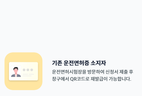 기존 운전면허증 소지자의 경우 운전면허 시험장을 방문하여 신청서 제출 후 창구에서 QR코드로 모바일 신분증 재발급이 가능합니다.