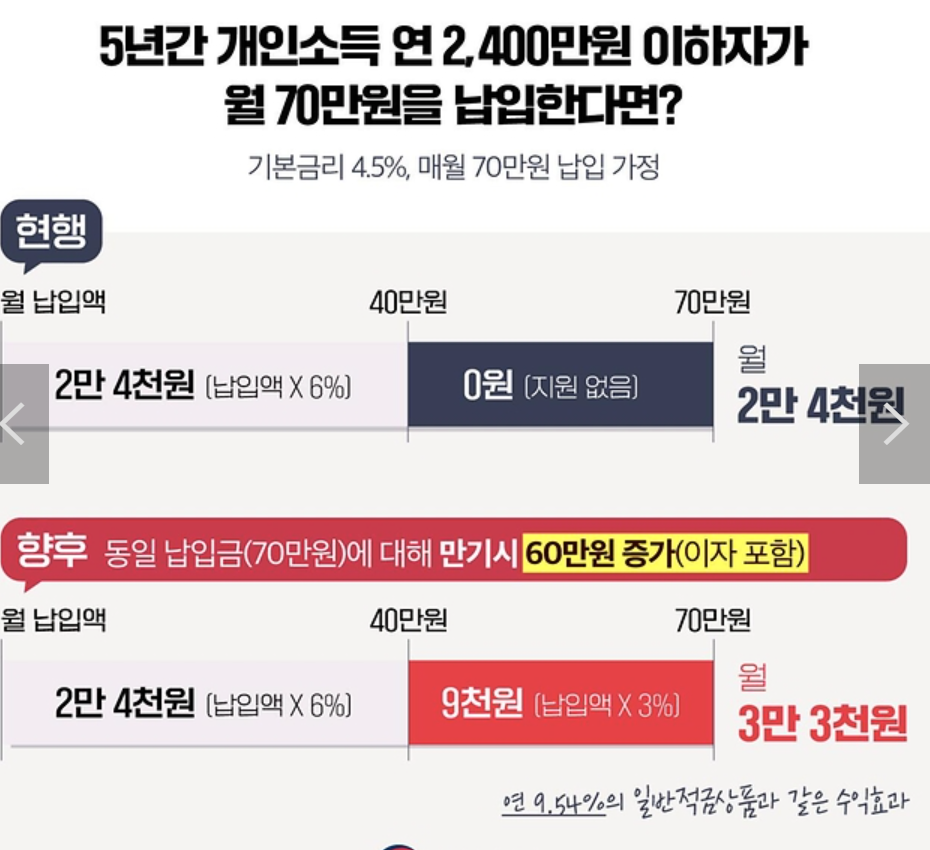 - 최대 모을 수 있는 금액: 월 최대 70만 원 납입 시 5년간 약 5,000만 원 이상 모을 수 있음