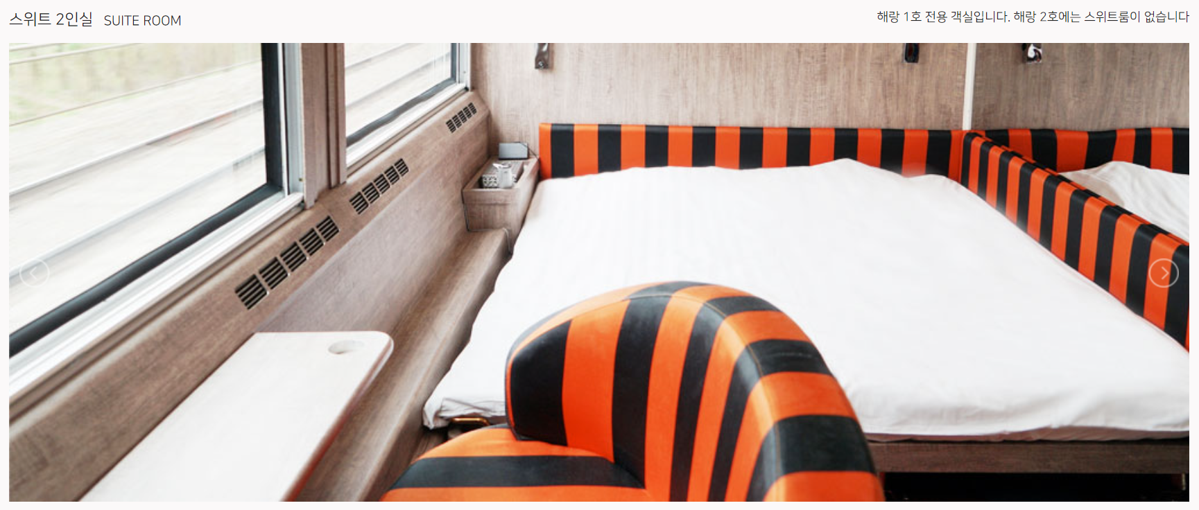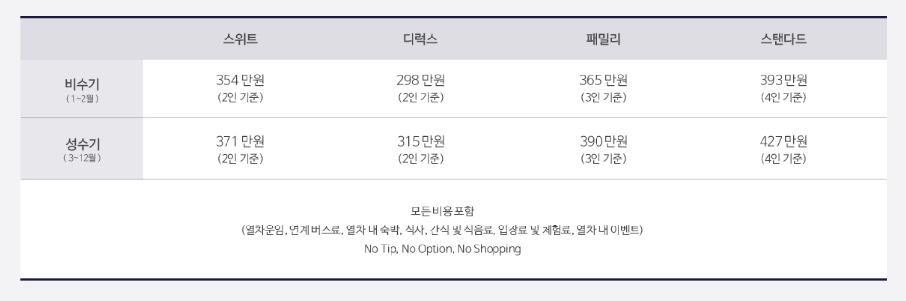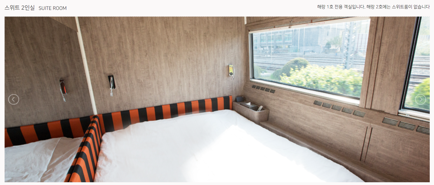 해랑열차 객실은 2인실 - 스위트룸과 디럭스, 3인실 패밀리, 4인실 스탠다드로 가격은 195만원-427만원으로 식비까지 모두 가격에 포함되어 구성되어 있습니다.